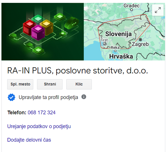 - Ureditev GMB profila z vsemi vašimi ažurnimi informacijami in vsebinami (lokacija, kontaktni podatki, delovni čas, logo, fotografije, kratek opis podjetja, dejavnosti)