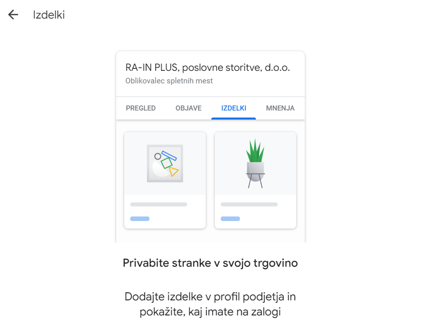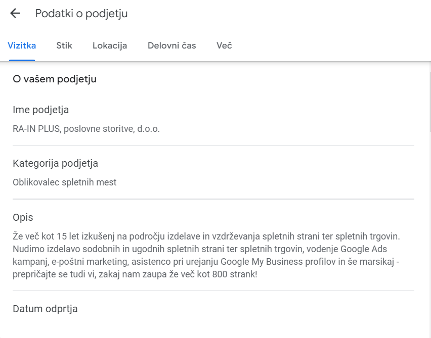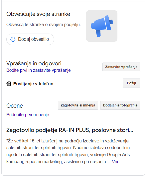 - Če vaše podjetje še nima GMB profila, ga ustvarimo za vas