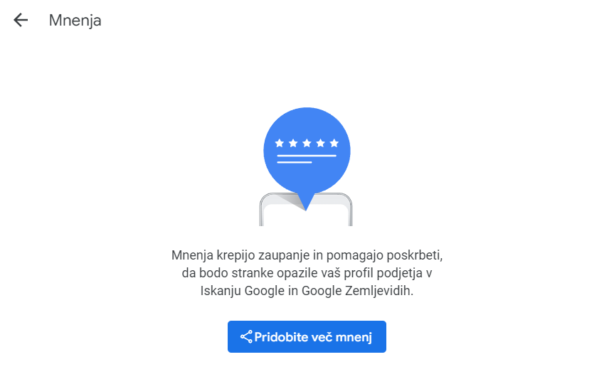 Pomembna funkcionalnost GMB profila so tudi online ocene, ki jih lahko podajajo stranke. Vplivajo na rangiranje vašega podjetja na Googlu, kot tudi na splošen sloves vašega podjetja med potencialnimi strankami, ki iščejo najbolj primernega ponudnika za želeno storitev.